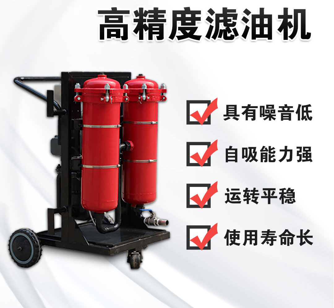 移动式高精度滤油机主要用于系统中油液杂质的过滤,双筒的设计结构可以同时过滤更多的介质,用户可以自己选择是双筒过滤还是单筒过滤,阀门可以随着需要决定是否打开,过滤器接触介质的部位全部采用不锈钢滤材,起到很好的防锈效果。该滤油机具有具有较高的精度和低噪声,使用维护方便等优点。