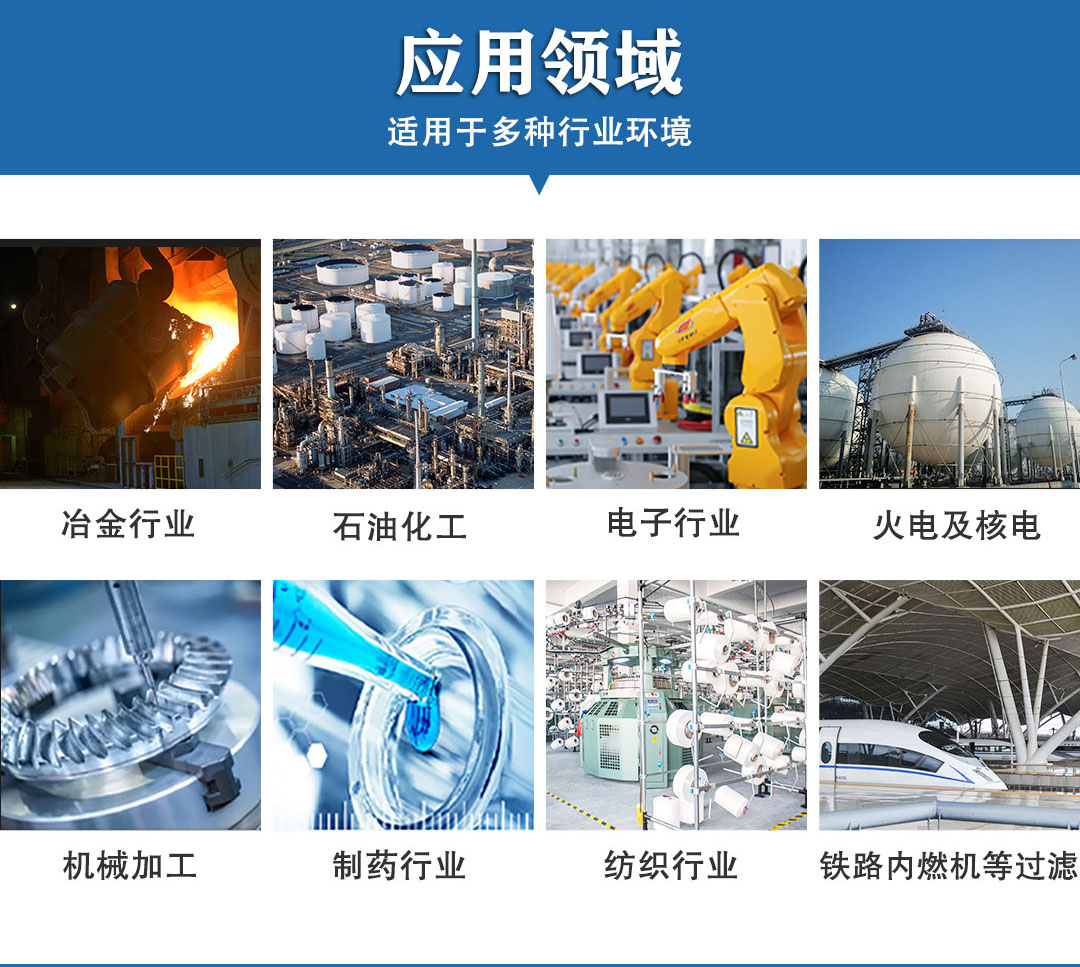 石油化工:过滤润滑油、石油/燃油添加剂、石油回收、从苯中分离聚合物、催化剂回收、过滤酸液、硷液、溶剂、清除碳黑和助滤剂、树脂、丙烯酸和黏胶乳剂的滤清、清除水管中的水垢、过滤TiO2溶液、清除表面活性剂的结晶盐份、X射线分散体及洗洁剂的滤清。