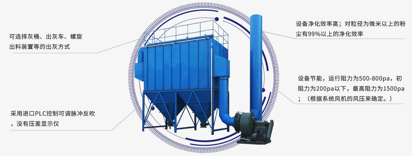 袋式除尘器是一种干式滤尘装置。它适用于捕集细小、干燥、非纤维性粉尘。滤袋采用纺织的滤布或非纺织的毡制成,利用纤维织物的过滤作用对含尘气体进行过滤,当含尘气体进入袋式除尘器后,颗粒大、比重大的粉尘,由于重力的作用沉降下来,落入灰斗,含有较细小粉尘的气体在通过滤料时,粉尘被阻留,使气体得到净化