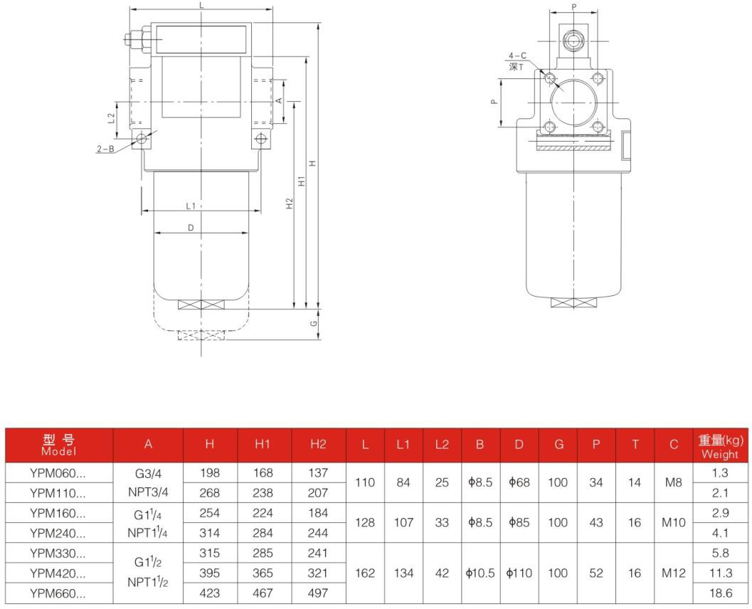 YPM160中压过滤器安装于液压系统压力管路中,滤除工作介质中的固体颗粒及胶状物质,有效控制工作介质的污染度。可以根据你需要装配压差发讯器及旁通阀。