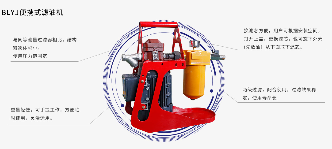 本滤油机包括一个由电机驱动的专用齿轮泵,具有噪音低、自吸能力强,运转平稳等特点 吸油囗粗过滤器保护油泵并延长主过滤器的使用寿命